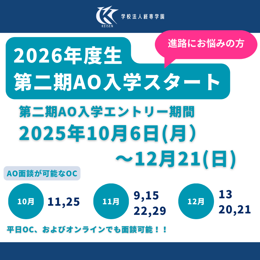 ご好評にお応えして、10/6(水)より第二期AO入学エントリースタート! まだ進路が決まっていない方、これから進路を考える方、ぜひご検討ください。 まずはオープンキャンパスに参加して☑してくださいね♪ 【エントリー期間:2025年10月6日~12月21日】